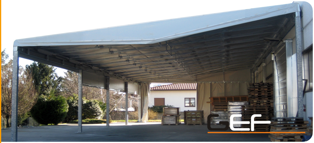 Le tettoie hanno i due lati posti sulla lunghezza adiacenti ai muri dei fabbricati che restano a vista, consentendo così l’ingresso direttamente alla copertura, mentre i restanti due lati sono aperti per consentire l’ingresso e l’uscita con la possibilità di essere chiusi con robuste tende scorrevoli.